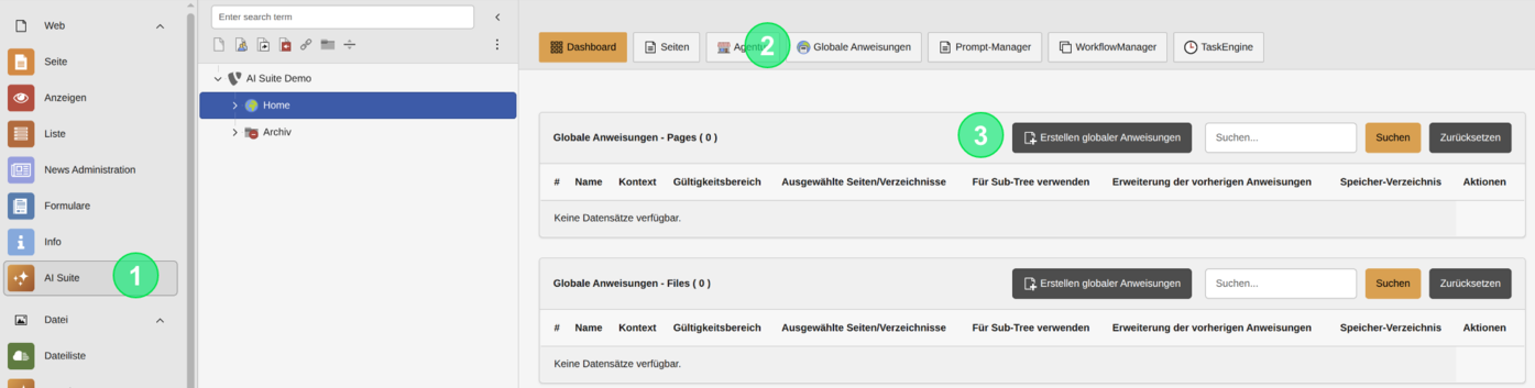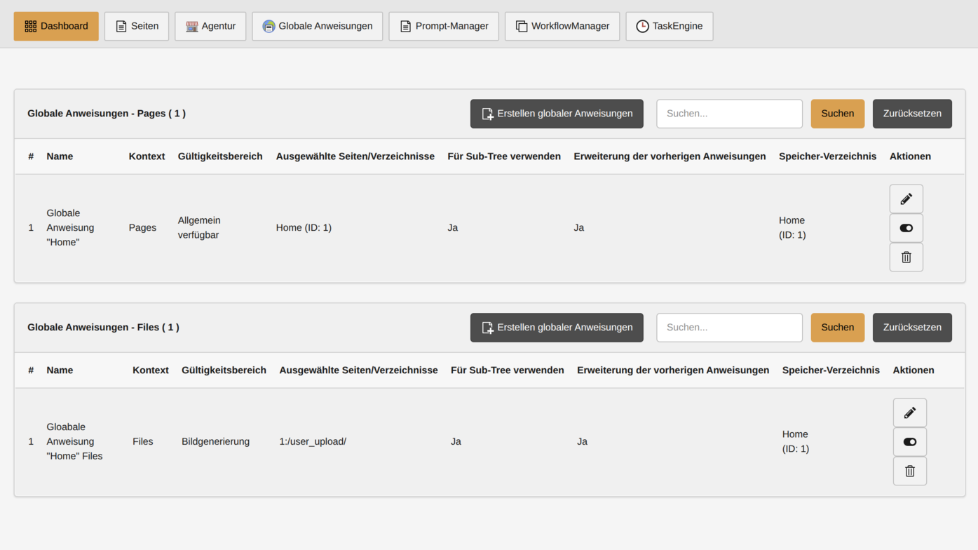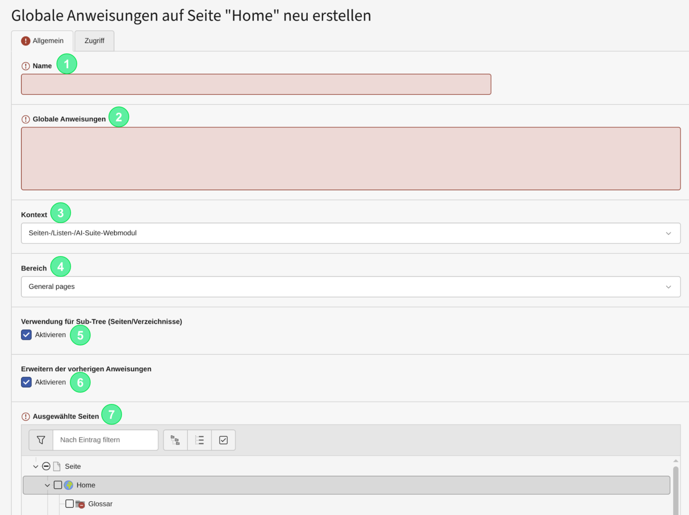 Seit den Versionen 13.8.0/12.14.0 habt ihr die Möglichkeit Globale Anweisungen anzulegen. Diese werden dann automatisch vor den jeweils eingegebenen Prompts bei jedem Request hinzugefügt. Globale Anweisungen können für verschiedene Gültigkeitsbereiche und Seiten angelegt werden. Außerdem besteht die Möglichkeit mehrere Globale Anweisungen innerhalb eines Seitenbaums zu kombinieren oder Vorherige zu überschreiben.