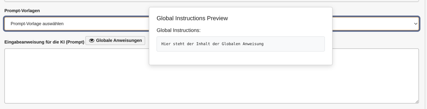 Sind für die gewählte Seite bzw. den gewählten Ordner und den Gültigkeitsbereich Globale Anweisungen vorhanden, erscheint oberhalb des Eingabefeldes für den jeweiligen Prompt ein entsprechender Button. Sobald über diesen Button “gehovered” wird, sieht man den Inhalt der Globalen Anweisung welcher hinterlegt ist und verwendet wird.